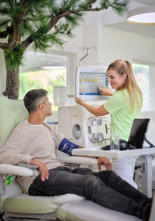 In unserer stilvoll eingerichteten Praxis bieten wir komfortable Dialyse-Plätze mit modernsten Geräten an. Neben den medizinischen Abklärungen und Besprechungen bereiten wir Sie auch psychisch auf die bevorstehende Dialyse vor und begleiten Sie auf Ihrem Weg zu einer allfälligen Nierentransplantation.